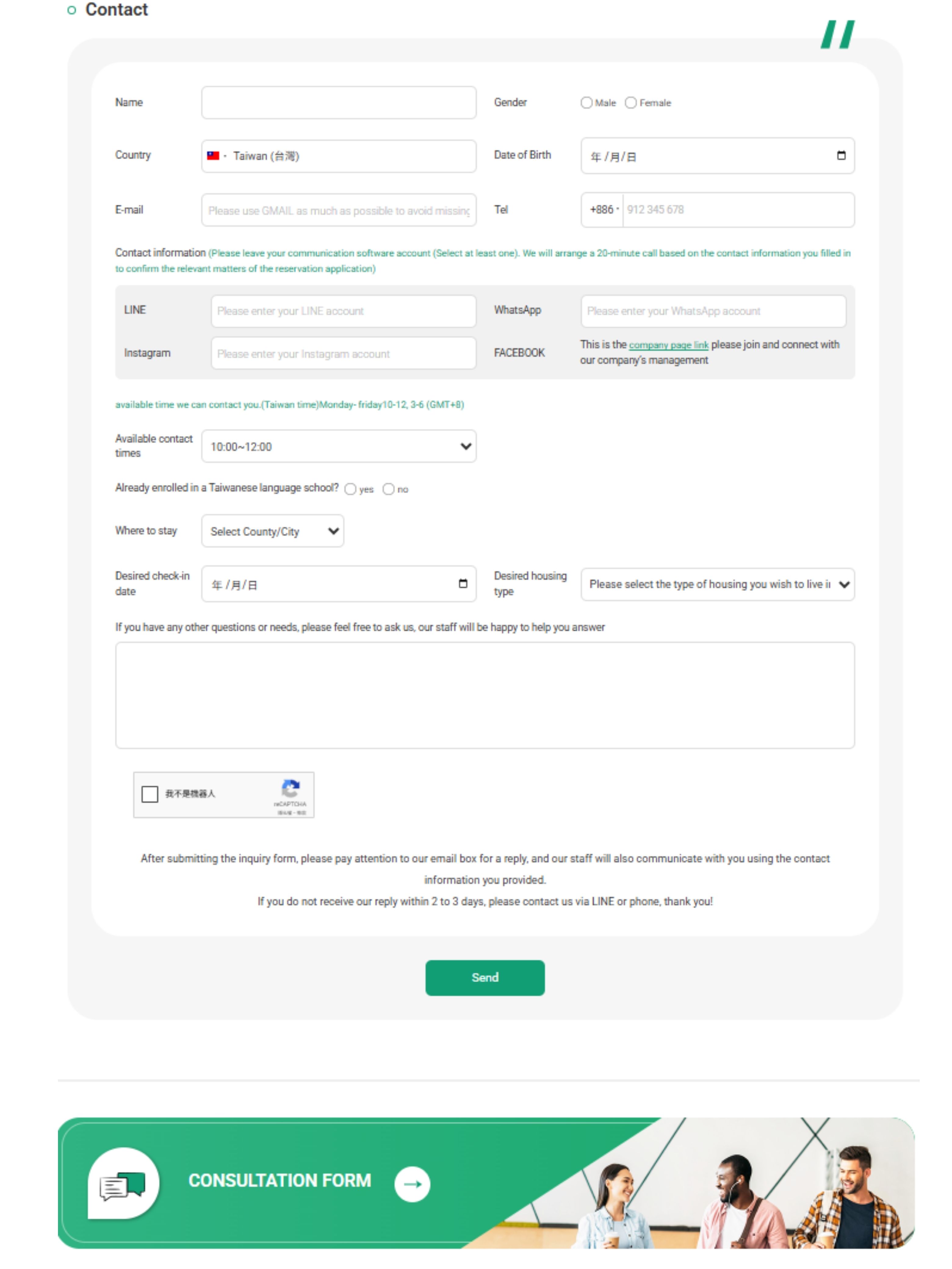 Once you find suitable accommodation, you can submit your information through the 【Application Form】 or 【Inquiry Form】, or contact us via LINE, WhatsApp, or Email. Afterwards we gather preliminary information about your move-in date, lease term, and school details.